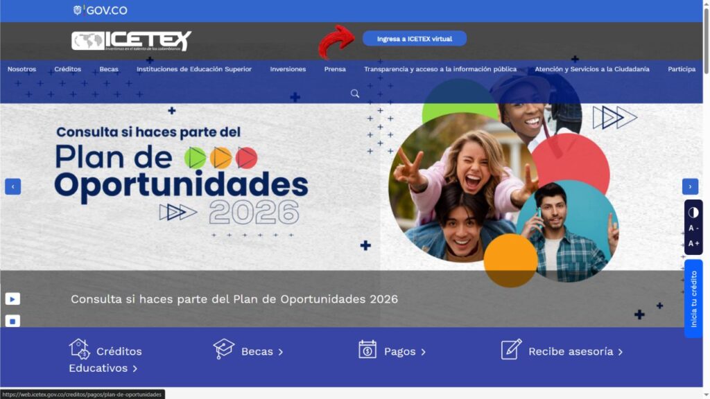 Para hacerlo, primero debes ingresar al portal oficial del ICETEX y ubicar en la parte superior de la página el botón “Ingresa a ICETEX Virtual”.