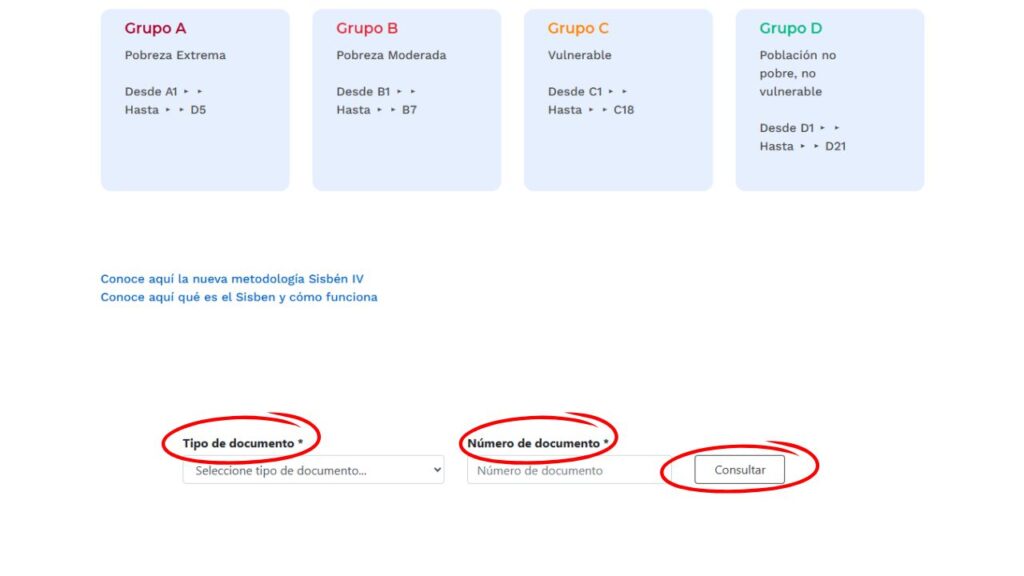 Con la versión Sisbén IV, ya no se asigna un puntaje entre 0 y 100. En su lugar, las personas se clasifican por grupos (A, B, C o D) y subgrupos, según su nivel de ingreso y condiciones socioeconómicas.